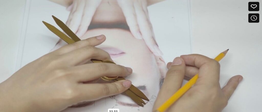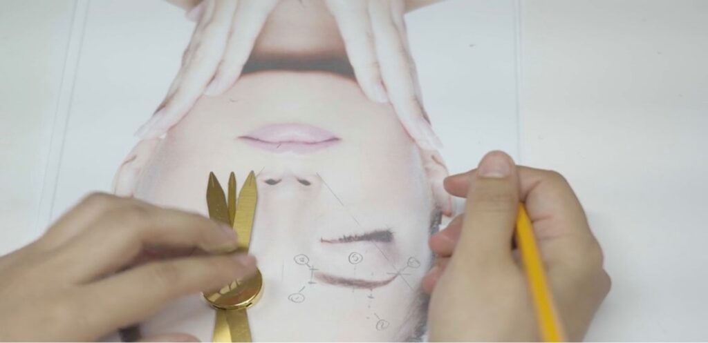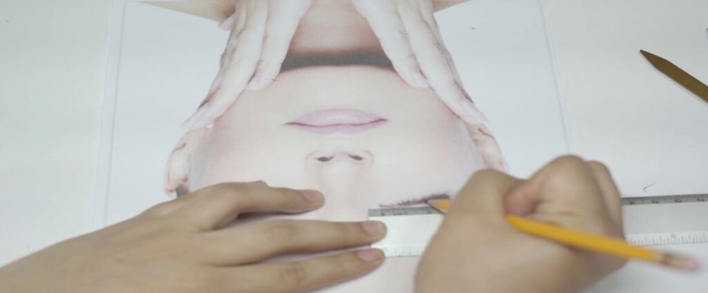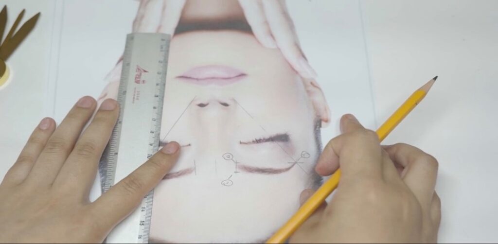 Colocamos nuestra regla de la aleta de la nariz al final del segundo tercio y trazamos