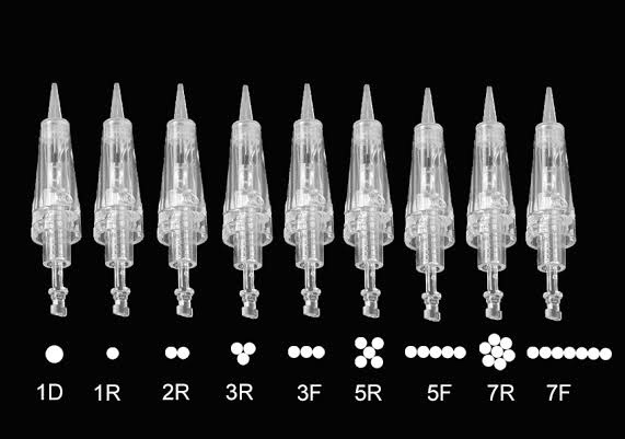Estos existen de diferentes medidas y formas, se caracterizan por tener nomenclatura que se compone de un número y una letra, el número significa cuántas agujas tiene y la letra es la forma que generan. Una “R” significa round, tipo de aguja circular y las que tienen una “F” significa flat, eso quiere decir que el patrón de la aguja es lineal.
