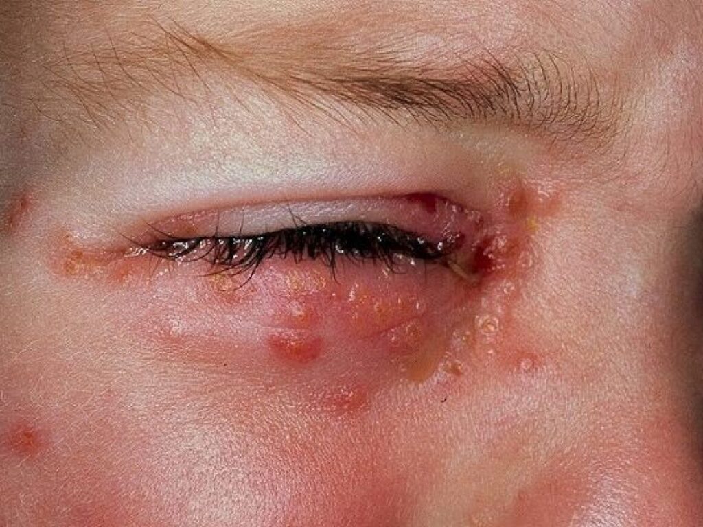 Inflamación alrededor de los ojos o bizquera. Puede provocar lesiones en la retina.