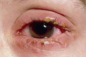 Formación de costra del párpado y la línea de las pestañas.