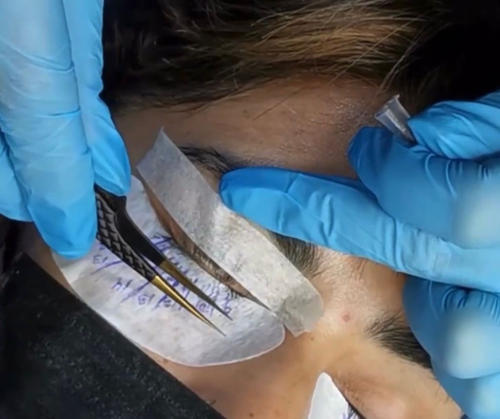 3. Coloca la cinta de forma horizontal sobre el párpado superior cerrado y estira el párpado hacia ti, para que las pestañas se levanten y te permita llegar y ver mejor la capa media e inferior de las pestañas. Esto te permite hacer un full set completo.